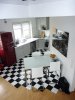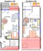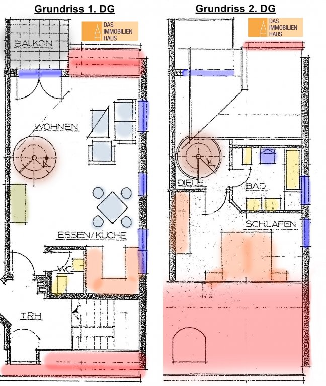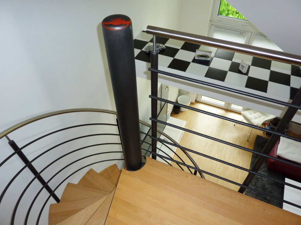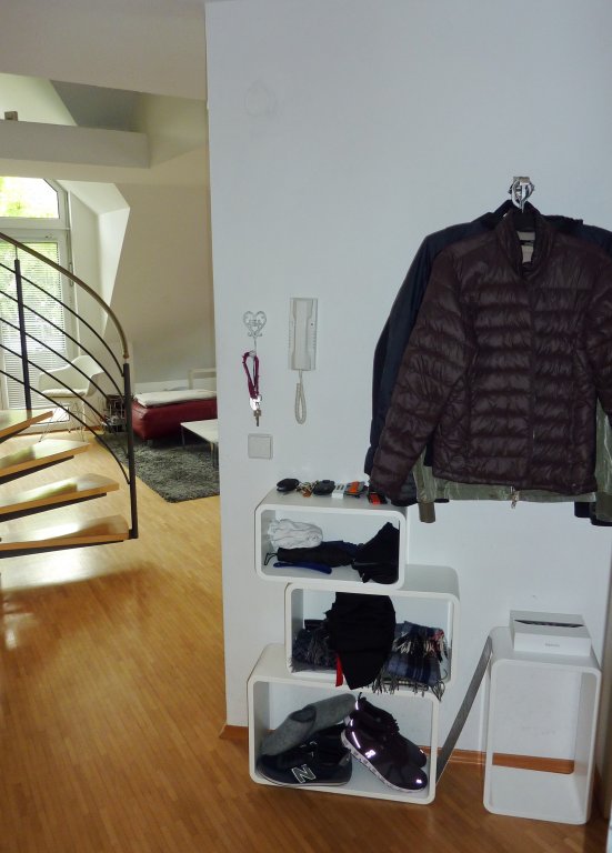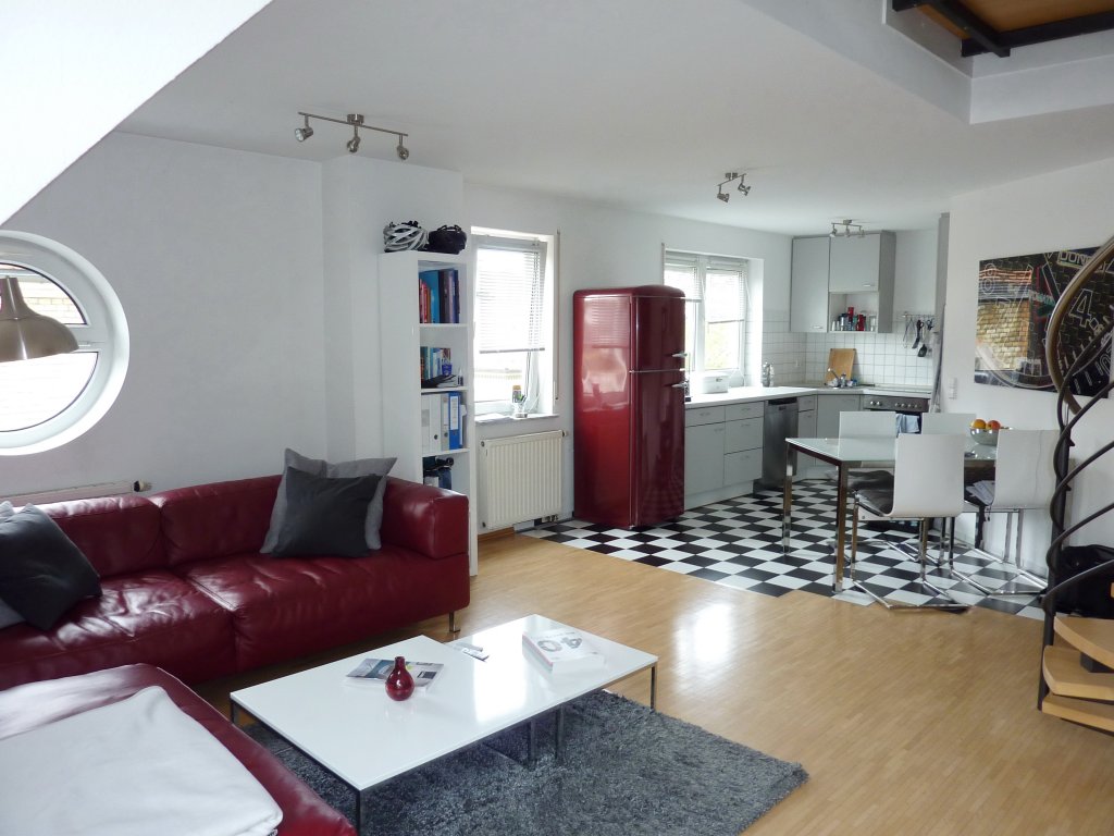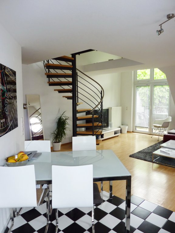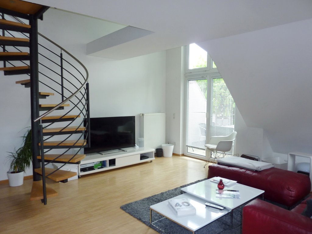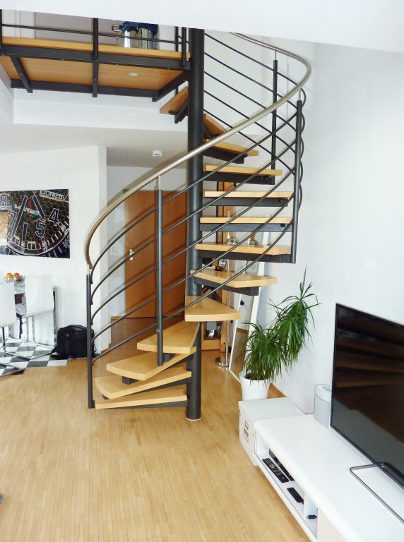 Sie ist wie folgt aufgeteilt: Eingang/Diele, separates Gäste-WC, „offene“ Küche (inkl. Einbauküche), großer und sehr heller Wohn-bereich mit Ausgang zum Balkon. Vom hier aus gelangt man über eine schicke Wendeltreppe in das 2. Wohnungsgeschoss mit Schlafzimmer und Tageslicht-Badezimmer (mit Badewanne, Waschbecken, WC, WM-/WT-Anschluss).
