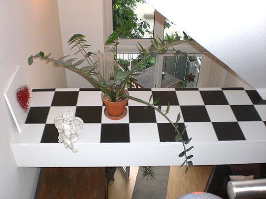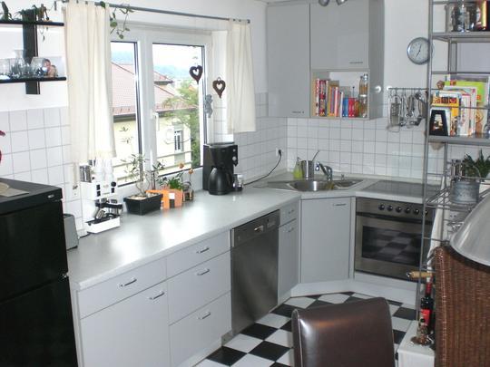 Parkettboden, moderne Einbauküche (ohne Elektrogeräte), Balkon