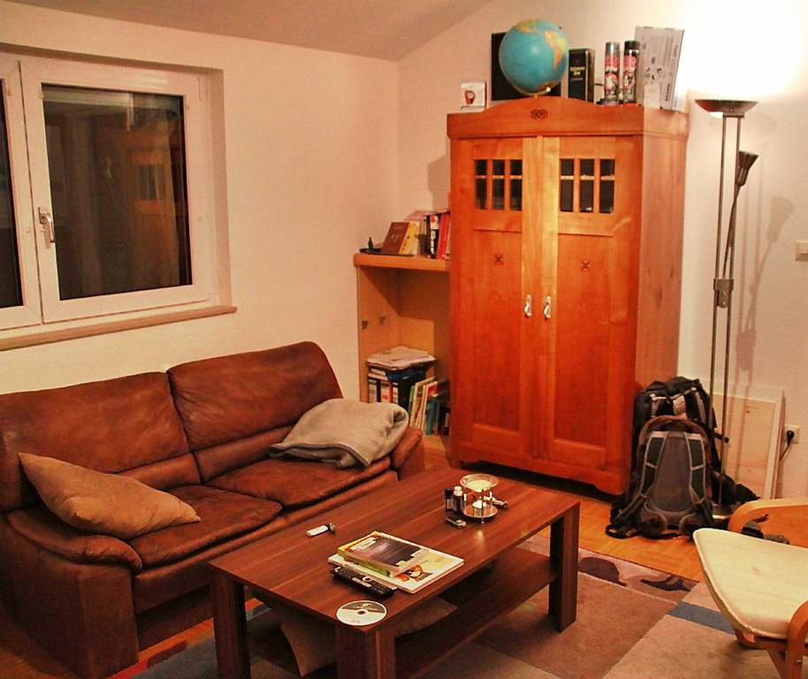 Im Dachgeschoss - auf der zur Straße abgewandten Seite - eines am östlichen Stadtrand gelegenen Hauses mit fünf Wohnungen. Im Erdgeschoss des Hauses befindet sich eine Gaststätte. Zur Stadtmitte/"Obertor" sind es ca. 2,5 km. Eine Bushaltestelle (Linie 21: "RV-Bahnhof - Grünkraut - Bodnegg") befindet sich direkt neben dem Haus.