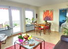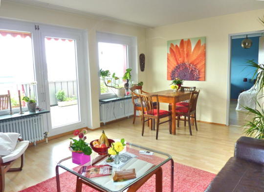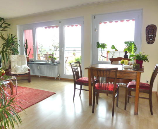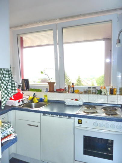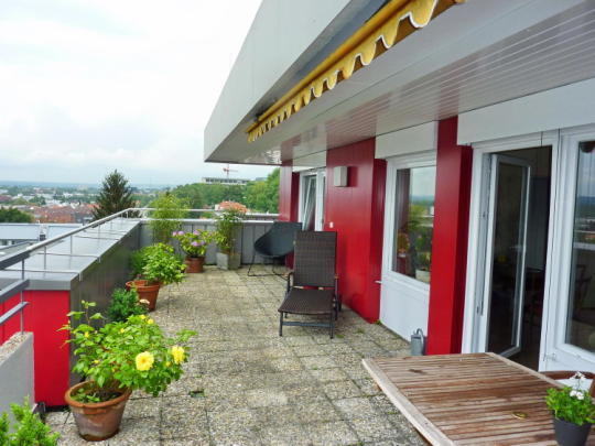 8. Obergeschoss / oberstes Geschoss, Aufzug, Laminat-Parkett bzw. Fliesen, Bad mit Badewanne + WC, abgeschlossene Küche mit Waschmaschinenanschluss, Kabelanschluss für Radio/TV, sehr große, nicht einsehbare Terrasse mit Markise und Panoramaaussicht!