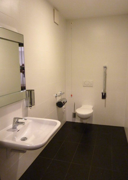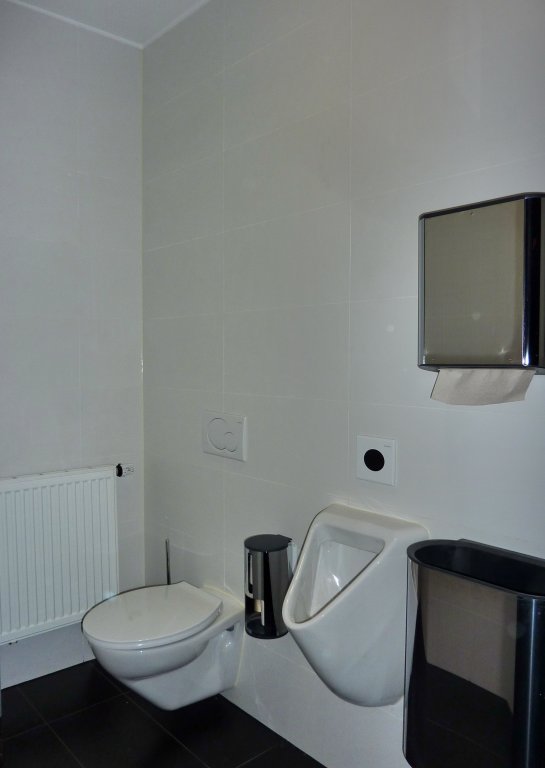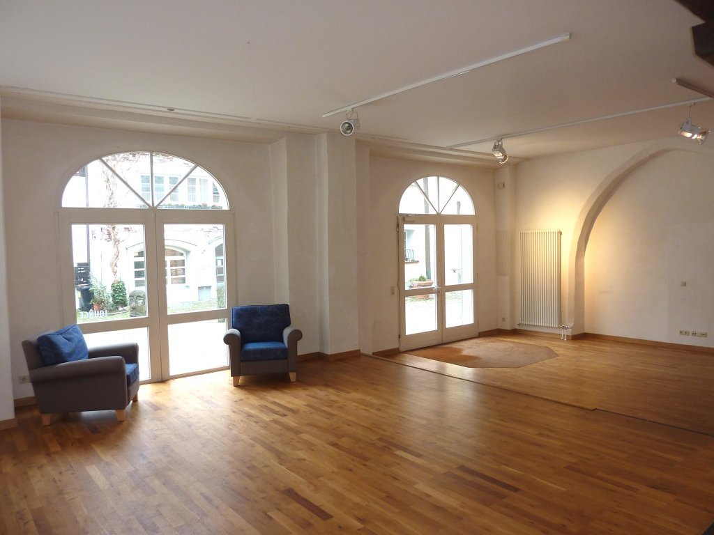 Der direkte Außenzugang dient quasi als Haupteingang. Über die rückwärtige Raumseite gelangt man zur „Teeküche“, den beiden WCs und dem Nebeneingang.