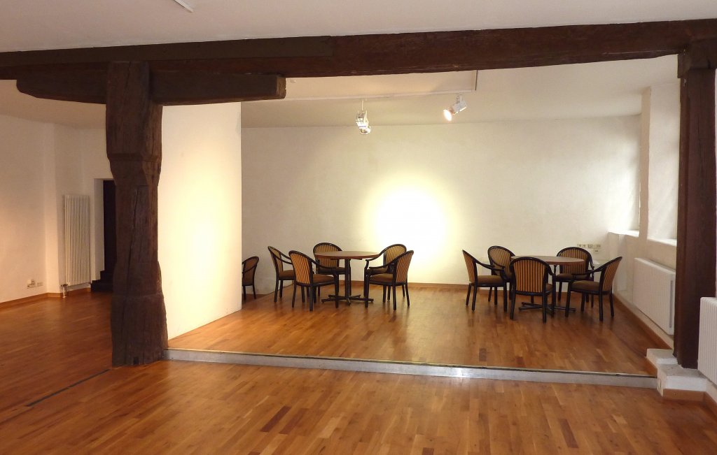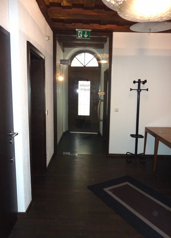 Die hallenartige Erdgeschossfläche weist eine imposante Holzbalkenanlage mit einem mächtigen Unterzug auf einer mit Sattelholz versehenen Stütze in der Raummitte auf, die dem Raum eine einmalige und auch von außen sichtbare dekorative Anmutung und repräsentative Wirkung verleiht. Die Räumlichkeiten wurden u.a. als Finanzdienstleistungsbüro und zuletzt vom Hotel Waldhorn als Lounge für gesellschaftliche Anlässe genutzt.