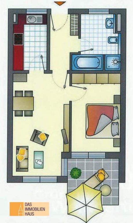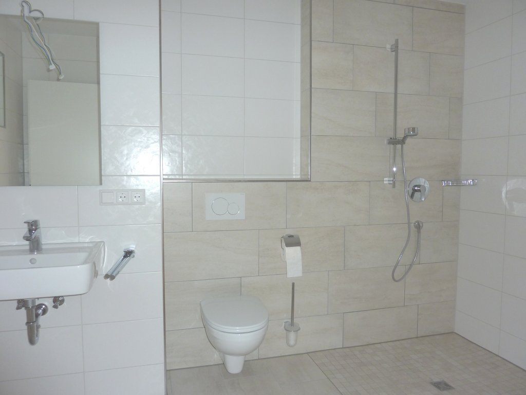 Die Wohnung ist wie folgt aufgeteilt: geräumiger Eingangs-bereich/Garderobe, Badezimmer (mit Waschtisch, bodengleicher Dusche und WC), Schlafzimmer, helles Wohnzimmer und Küche (inkl. hochwertiger Einbauküche). Sowohl vom Wohnbereich als auch vom Schlafzimmer gelangt man auf den großen, teilweise überdeckten, Balkon.