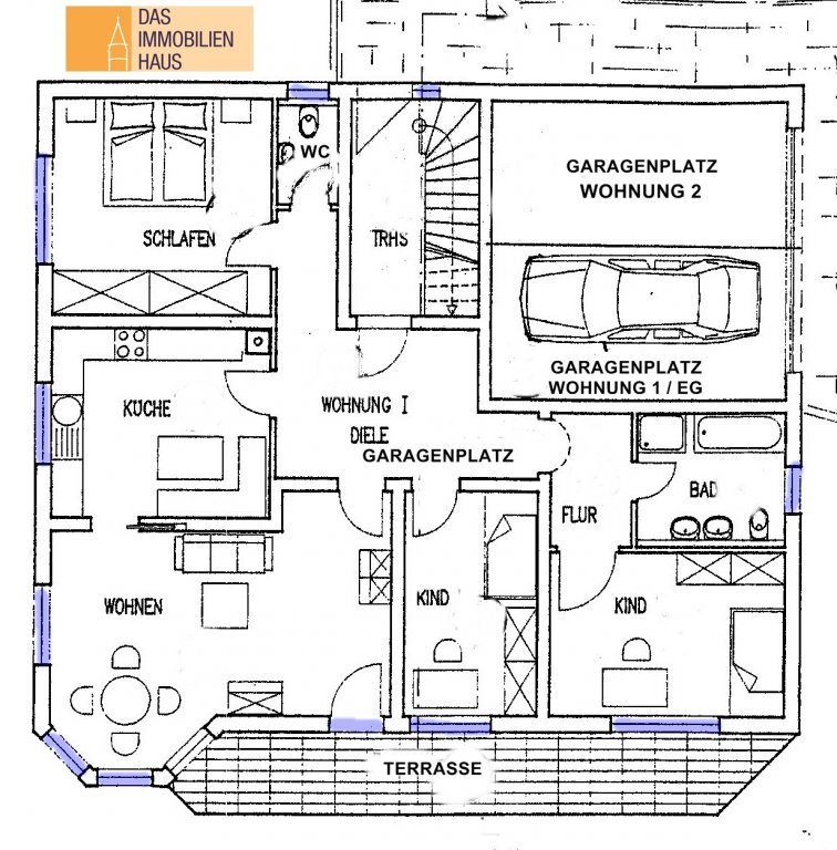 Zur Wohnung gehört ferner eine Garage, von der man auch direkt ins Haus gelangt (gegenüber Plan geändert!) und ein eigener Kfz-Stellplatz im Freien.