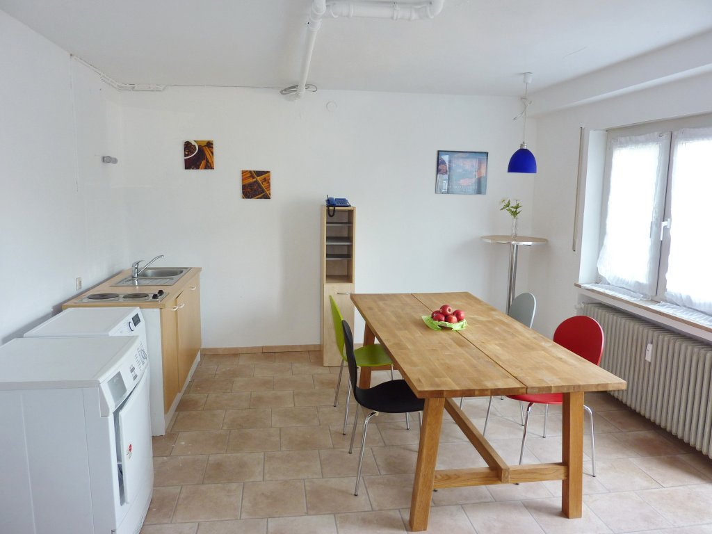 Gemeinschaftsraum mit großem Esstisch, Waschmaschine und Wäschetrockner