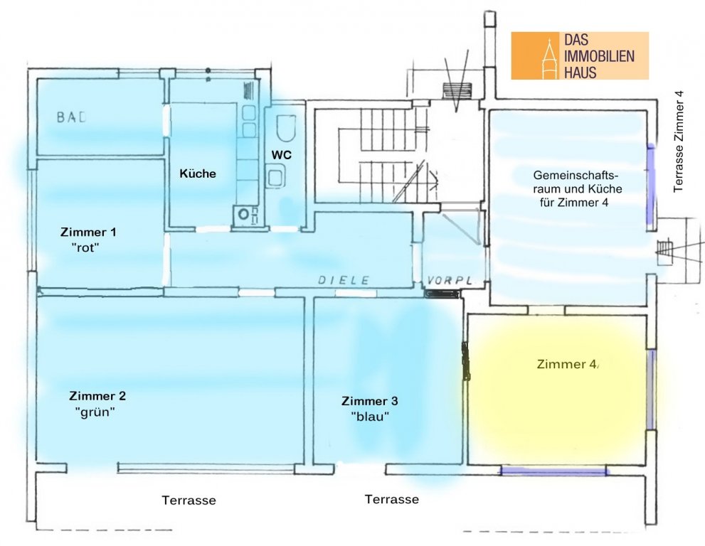 Die Wohnung ist wie folgt aufgeteilt: Diele/Flur, separates WC, Badezimmer mit Fenster, Küche mit kompletter Einbauküche, Gemeinschaftsraum mit großem Esstisch, Waschmaschine und Wäschetrockner sowie vier verschieden große Zimmer, teilweise mit direktem Terrassen- bzw. Gartenzugang. Zwei der Zimmer haben direkten Zugang zur Terrasse und zum vorgelagerten Garten, das andere Zimmer hat einen „eigenen“ Gartenanteil, der über den Hauseingang zugänglich ist. Kostenlose Parkmöglichkeiten sind im direkten Umfeld ausreichend vorhanden. Auf Wunsch kann ein eigener Kfz-Stellplatz angemietet werden (20 €/Monat).