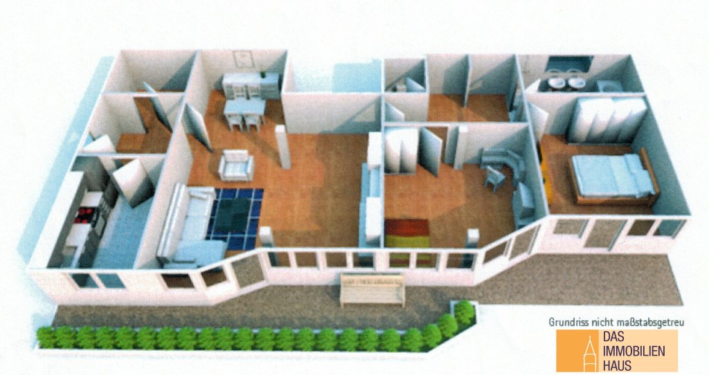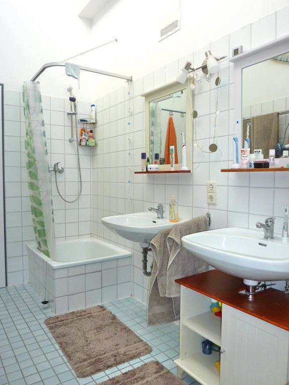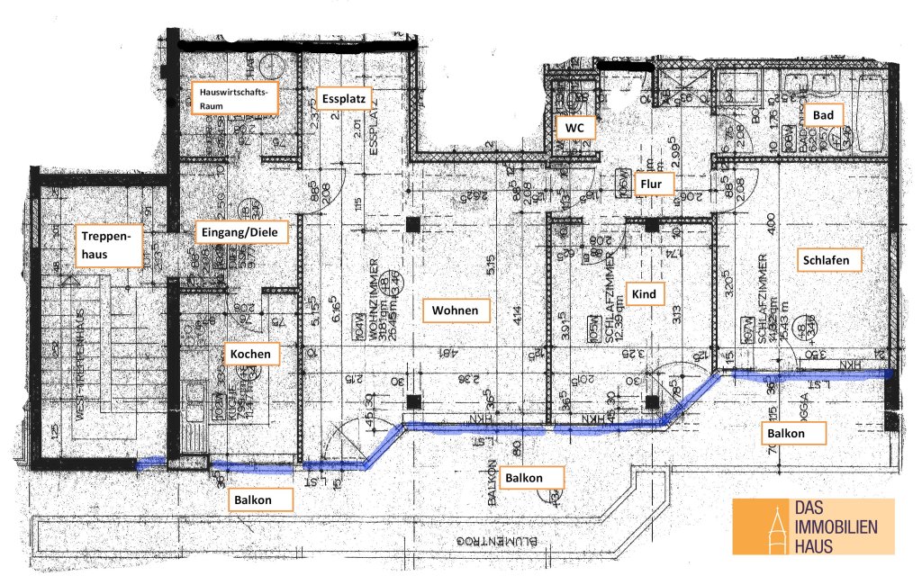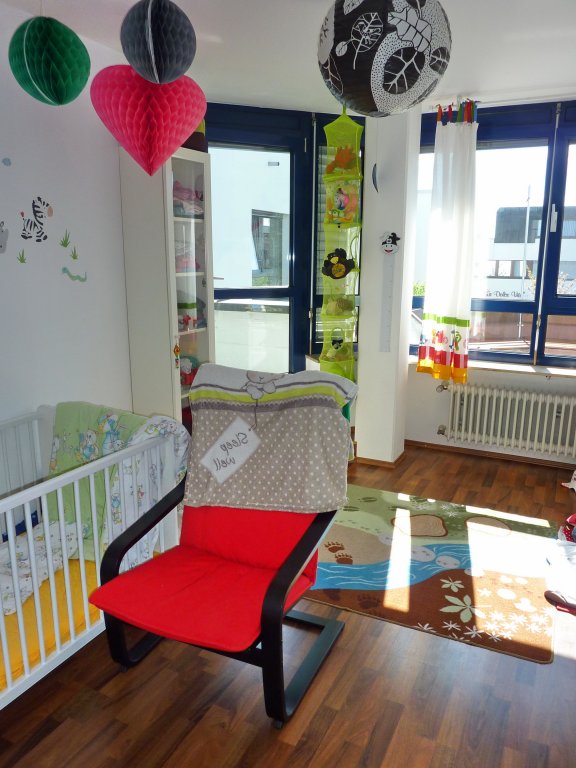 Sie ist wie folgt aufgeteilt: Diele/Garderobe, Küche (die vorhandene Einbauküche kann günstig übernommen werden), Hauswirtschaftsraum, großzügiges Wohnzimmer (ca. 31 m²) mit hellem Essplatz, Badezimmer (2 Waschbecken, Wanne und Dusche), Schlafzimmer, Kinderzimmer. Der große Balkon ist sowohl vom Wohnzimmer als auch beiden Schlafräumen zugänglich.