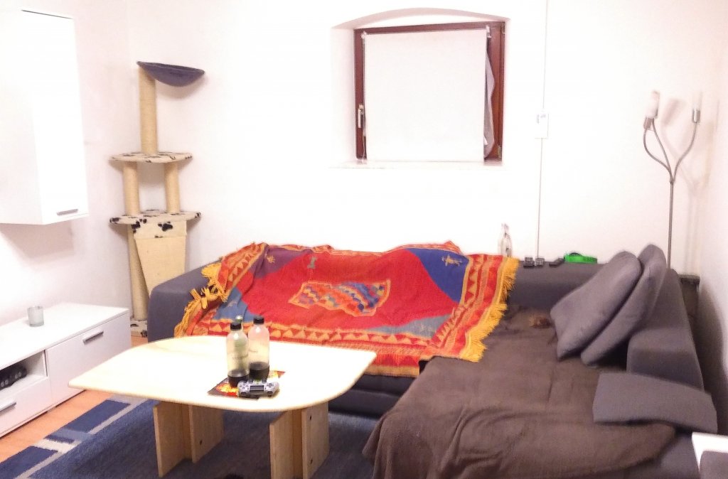 Die (sehr) einfach ausgestattete Wohnung ist wie folgt aufgeteilt: Eingang/Flur, Badezimmer (innenliegend – mit Wanne, WC, Waschbecken, Waschmaschinenanschluss), „offener“ Kochbereich (mit einfacher Einbauküche – ohne Kühlschrank), daran angrenzendes Esszimmer, Wohnzimmer, Schlafzimmer.