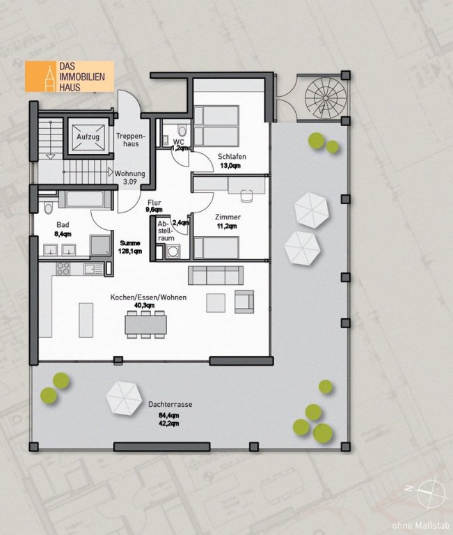 Die Wohnung ist wie folgt aufgeteilt: Diele, Abstellraum mit WM-/WT-Anschluss, Tageslichtbad (mit Doppelwaschtisch, Wanne, Dusche und WC), separates Gäste-WC, zwei Schlafräume, großer Koch-Ess-Wohnbereich mit integrierter, hochwertiger Küche (inkl. Einbauküche mit MIELE-Elektrogeräten). Von sämtlichen Räumen hat man Zugang auf die Dachterrasse(n).