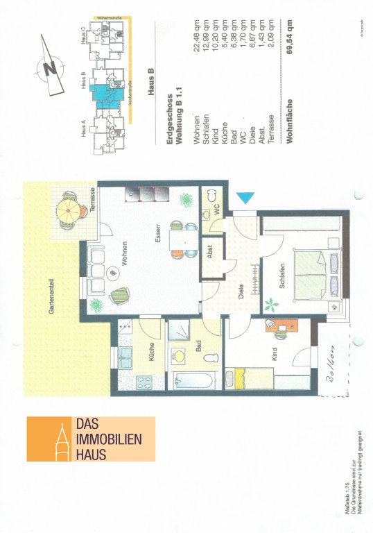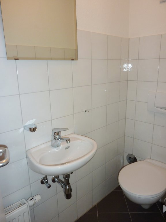 Die Wohnung ist wie folgt aufgeteilt: Eingang/Diele, Abstellraum, separates Gäste-WC, Bad (mit Badewanne, Dusche, Waschbecken und WC), zwei Schlafzimmer (eines davon mit kleinem Balkon), abgeschlossene Küche (inkl. Einbauküche mit neuem Herd/Backofen)
