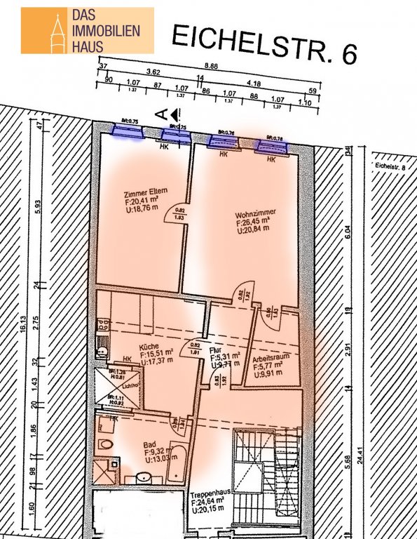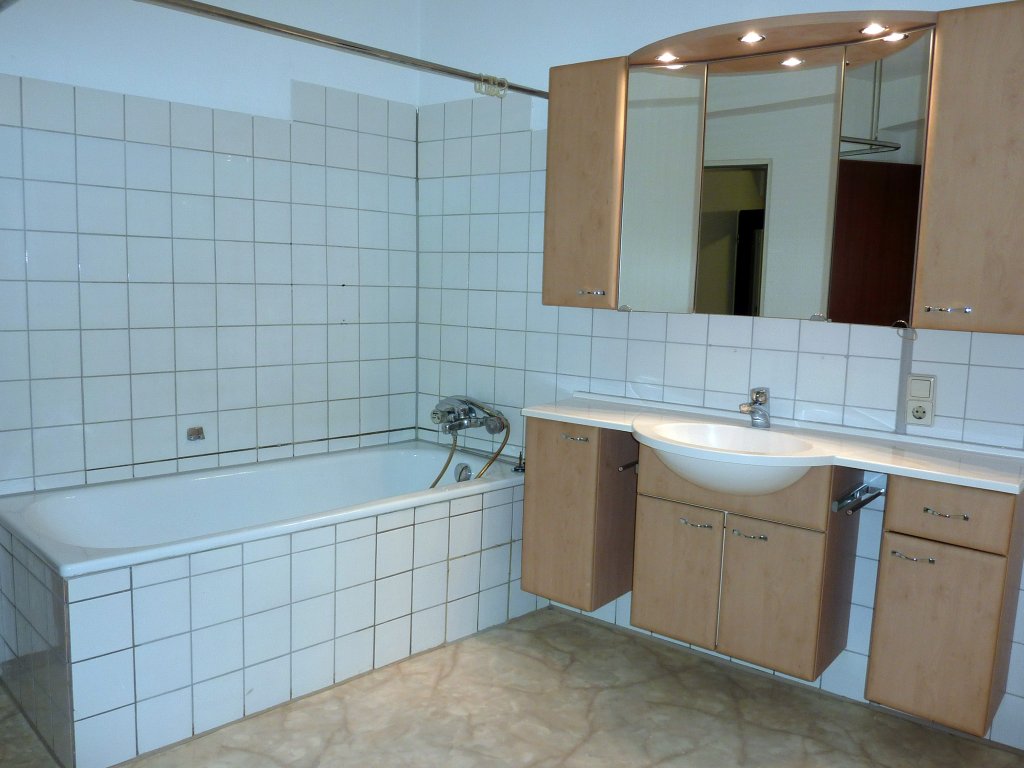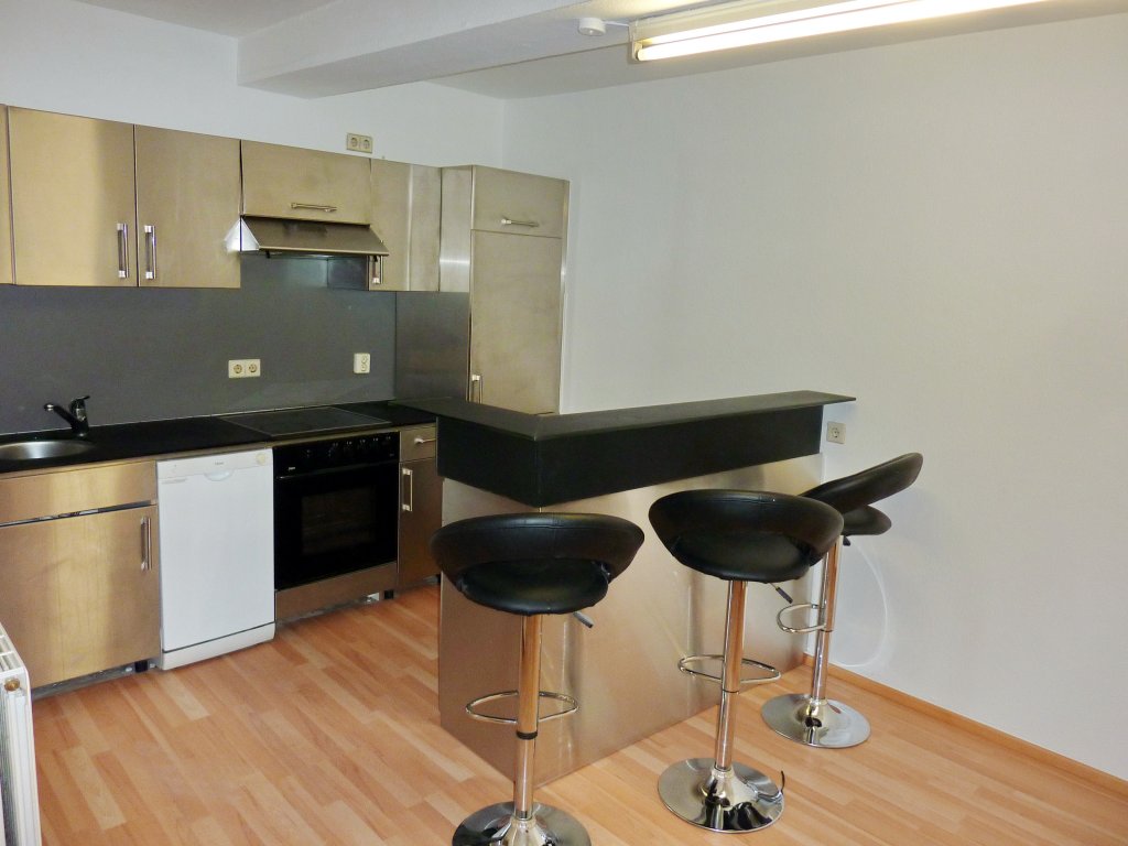 Sie ist wie folgt aufgeteilt: Diele, Wohn-Essküche mit Theke, innenliegendes, älteres Badezimmer (mit Waschbecken, Badewanne, WC und Anschluss für Waschmaschine), großer Abstellraum, Wohnzimmer und Schlafzimmer zur Eichelstraße hin. Die vorhandene, komplett ausgestattete Einbauküche (mit Herd, Backofen, Spülmaschine, Kühlschrank) wird zur kostenlosen Nutzung überlassen.