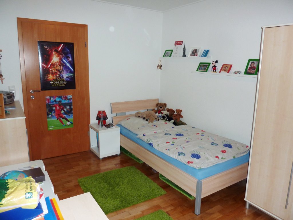 Die geräumige und gemütlich ausgestattete Wohnung ist wie folgt aufgeteilt: Eingangs/Flur, separates WC (mit Fenster), kleines (!) Tageslichtbad (mit Waschbecken, Wanne und Dusche), Schlafzimmer mit extra Ankleideraum, zwei Kinderzimmer, Diele, abgeschlossene Küche (inkl. Einbauküche) mit schönem Essplatz und Ausgang zum großen Balkon, geräumiges Wohnzimmer.
