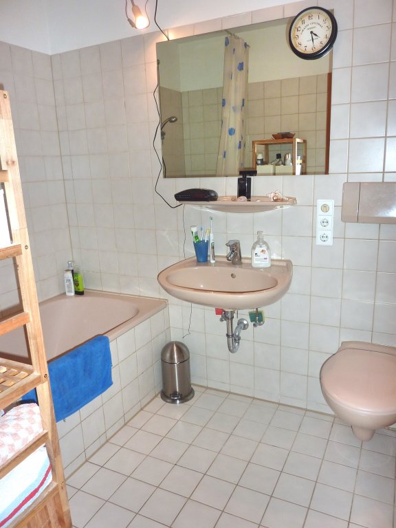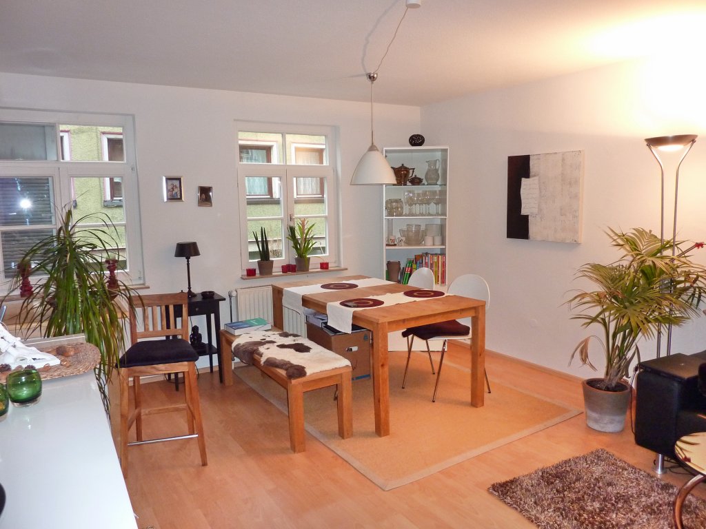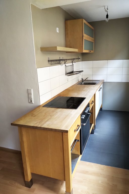 Die Wohnung selbst wurde erst 2012 umfassend renoviert (frisch tapeziert, gestrichen, neuer Laminatboden,...). Das Badezimmer besitzt eine Badewanne. Die Wohnung ist wie folgt aufgeteilt: Eingang/Diele mit Garderobe, Badezimmer (Waschbecken, Badewanne, WC), Schlafzimmer mit kleinem „Innenhof“-Balkon, Wohn-Esszimmer mit separater Kochnische mit Fenster. Die vorhandene Einbauküche mitsamt Kühlschrank wird kostenlos zur Verfügung gestellt.