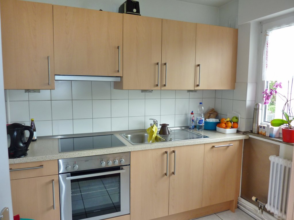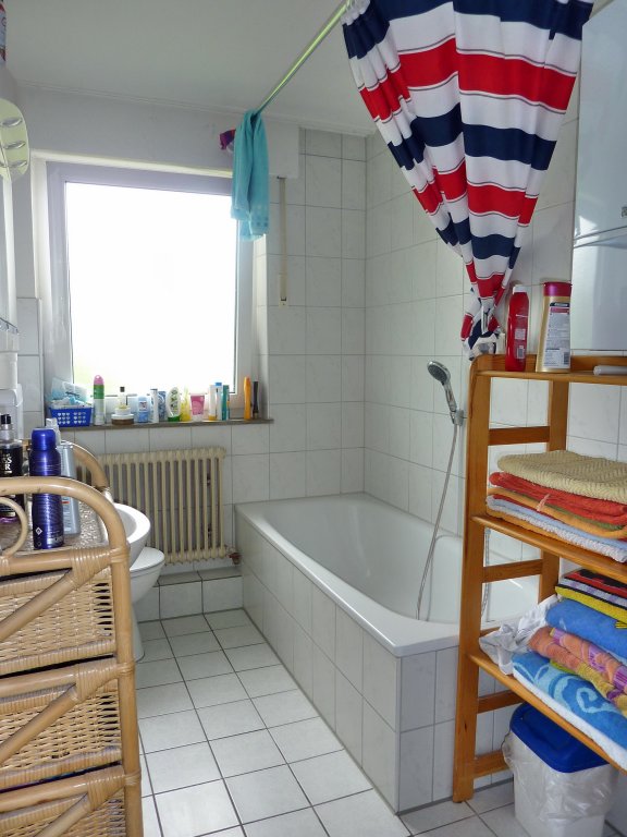 Die umfassende Renovierung der Wohnung (u.a. neue Böden, Wände, …) durch den Vermieter wurde gerade abgeschlossen. Sie ist wie folgt aufgeteilt: Eingang/Diele, abgeschlossene Küche (ohne Einbauküche!) mit angegliederter, heller Wohn-Essdiele, Tageslichtbad (mit Wanne, Waschbecken und WC), Schlafzimmer, zwei Kinderzimmer. Der große Westbalkon (mit Markise) ist sowohl vom Wohnzimmer als auch einem Kinderzimmer zugänglich.