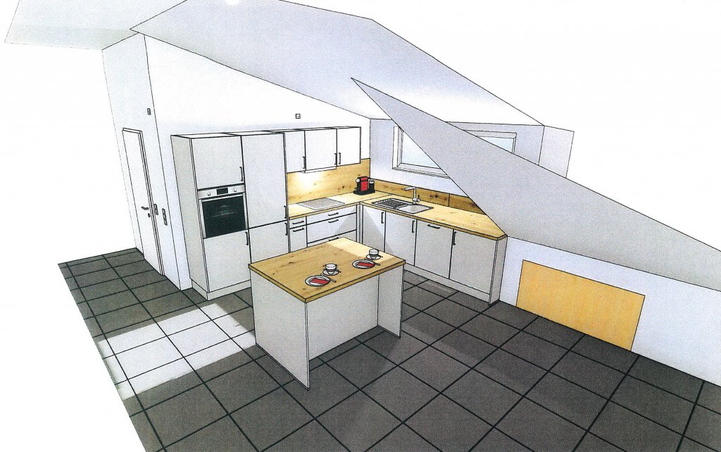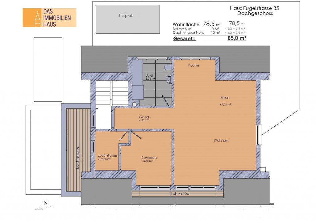 Diese chice, großzügige Wohnung ist wie folgt aufgeteilt: Eingang/Diele, Tageslichtbad (mit Wanne, Dusche, Waschtisch und WC), sehr geräumiger Wohn-Essbereich (gesamt über 41 m²!) mit integrierter neuer PLANA-Einbauküche , Schlafzimmer, zusätzlicher kleiner (Ankleide-/Büro-)Raum mit Zugang zur Dachterrasse.