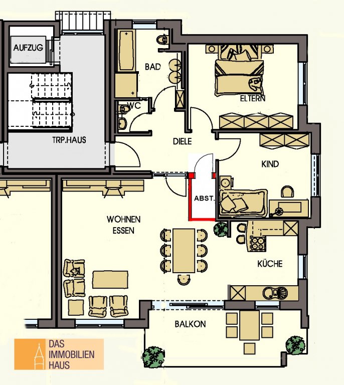 Die Wohnung selbst ist nach Süden und Westen ausgerichtet. Sie ist wie folgt aufgeteilt: Eingang/Diele mit Garderobe, Abstellraum, Tageslichtbad (mit Badewanne, Dusche, 2 Waschbecken und WC), zwei Schlafzimmer, zum Wohnbereich hin „offene“ Küche und großes Wohn-Esszimmer (ca. 36 m²) mit Ausgang zum Südbalkon.